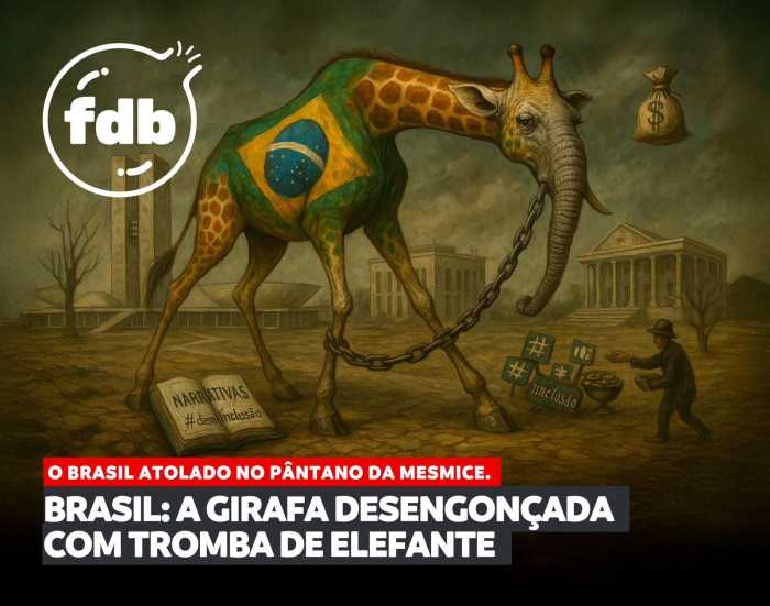 Hoje, o Brasil é exatamente essa criatura grotesca: uma girafa desengonçada, com pernas demais, corpo demais, Estado demais e com uma tromba de elefante que não faz nada além de atrapalhar o caminho. Temos potencial para ser uma potência mundial, mas somos conduzidos por um projeto que prefere nos manter rastejando. Poderíamos ser protagonistas no cenário global, mas escolhemos o papel de bobo da corte no picadeiro latino-americano. Poderíamos ser um país de cidadãos livres, mas insistimos em agir como rebanho domesticado.